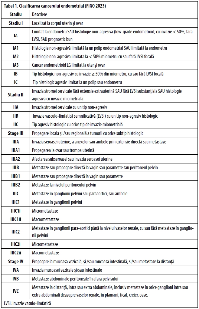 FIGO a stabilit o nouă clasificare stadială în 2023 (Tabel 1) (9). Ea statuează rolul chirurgiei ca element principal al stadializării, alături de informațiile furnizate de examenul histopatologic clasic (tip histopatologic, grad tumoral, invazie vasculo-limfatică) și accentuează importanța identificării subtipului molecular al tumorii pentru corecta stadializare, stratificare a riscului, tratament și prognostic.