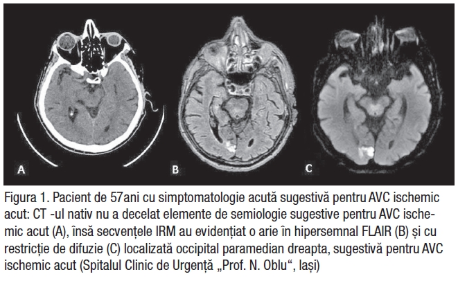 Integrarea imagisticii cranio-cerebrale avansate este fundamentală pentru o evaluare rapidă și detaliată a leziunilor cerebrale, permițând diferențierea tipurilor de AVC și ghidarea deciziilor terapeutice (Săceleanu et al., 2023). Deși tomografia computerizată (CT) este modalitatea imagistică inițială cel mai frecvent utilizată datorită rapidității și disponibilității sale, imagistica prin rezonanță magnetică (IRM) a câștigat teren în evaluarea AVC ischemic acut, oferind o evaluare superioară a integrității parenchimului, viabilității țesuturilor și extinderii leziunilor ischemice (Cortés-Albornoz et al., 2025). Mai mult, IRM-ul prezintă o sensibilitate și specificitate superioare în detectarea modificărilor acute legate de AVC, cum ar fi edemul citotoxic în stadiile incipiente, și poate estima momentul debutului AVC pe baza neconcordanței dintre imaginile ponderate în difuzie (DWI) și cele recuperate prin inversie atenuată prin fluid (FLAIR). Aceste capacități fac din IRM o modalitate imagistică de elecție pentru cazurile complexe, unde precizia diagnosticului influențează direct managementul terapeutic (Bhat et al., 2020).