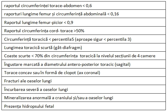 Folosind criteriile ecografice pentru letalitate, mai ales raportul torace-circumferință abdominală <0,618 și raportul lungimea femurului și circumferința abdominală <0,16 sugerează puternic letalitatea.8 Când sunt vizualizate anomalii concomitente în alte sisteme de organe, există o morbiditate și mortalitate crescută. În literatură se descriu numeroși indici și markeri ecografici asociați cu letalitatea unei displazii scheletale. (tab. 2)