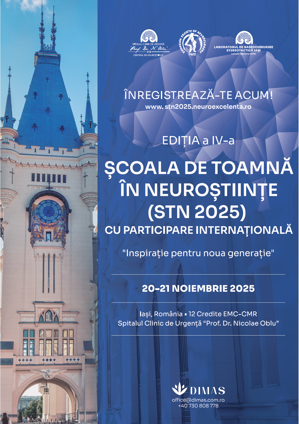 În perioada 20-21 Noiembrie 2025, Spitalul Clinic de Urgență „Prof. Dr. Nicolae Oblu” din Iași va găzdui cea de-a IV-a ediție a Școlii de Toamnă în Neuroștiințe Moderne cu participare Internațională, un eveniment de referință pentru specialiștii în neurologie, neurochirurgie și neuroștiințe din România.