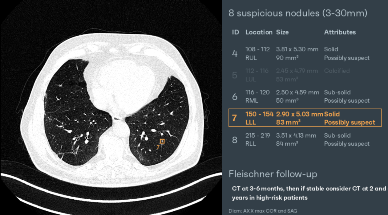 De asemenea, software-ul furnizează recomandări standardizate de follow-up, conform ghidurilor actuale, facilitând astfel o abordare mai rapidă, precisă și uniformă a cazurilor. Prin aceste funcționalități, AI-ul sprijină radiologul în depistarea precoce a leziunilor, reducând riscul de omisiuni și contribuind la o stratificare mai adecvată a riscului pacientului.