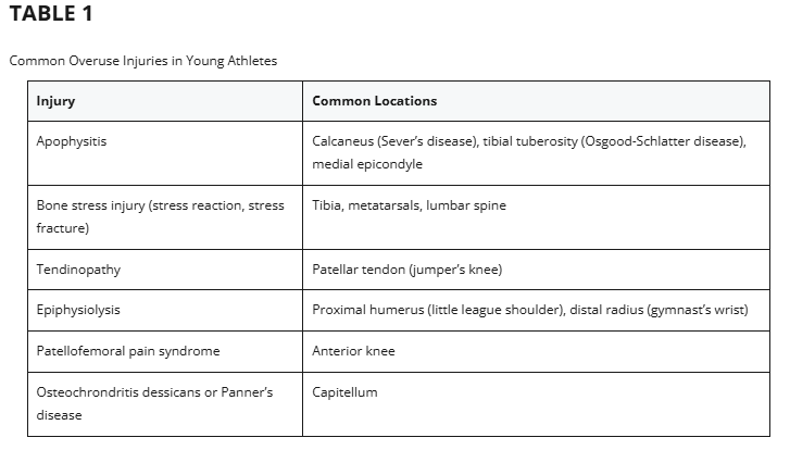 Among the most common overuse injuries in sports are: tendinopathies, ’’shin splints’’, apophysitis, Osgood-Schlatter disease, Sever’s disease and low back pain.