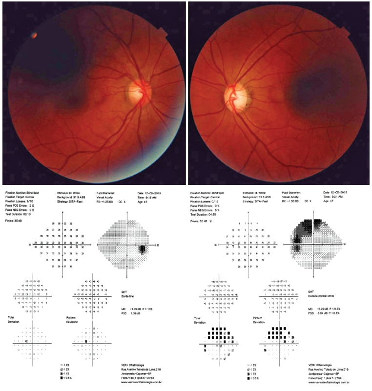 Fig. 2 Pacient de 48 de ani, cu cefalee de 2 ani, PIO normale, cornee normală, subțiere localizată SNFR temporal, defect în CV temporal superior, fără discromatopsie, tratată ca glaucom, la 45 zile discromatopsie și înrăutățire CV RMN relevă anevrism de ACI ce comprimă n.o, trimis la neurochirurg. (Sus – aspectul fundului de ochi, jos – aspectul câmpului vizual).