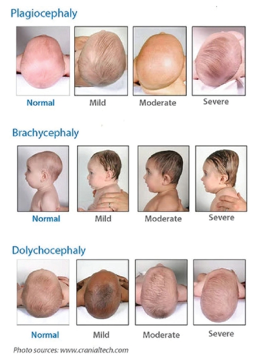 În funcție de tipul deformării craniului, există mai multe tipuri, după cum urmează: plagiocefalie, dolicocefalie și brahicefalie.