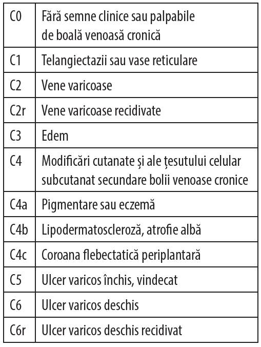 Clasificarea modernă a bolii venoase cronice este complexă și ține cont de o serie de factori – clinic, etiologic, anatomic, patologic. Criteriul clinic ne interesează în mod special.