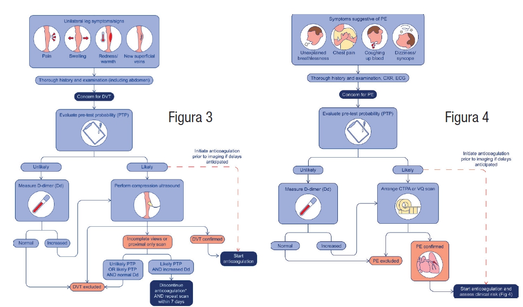 Diagnosticul se bazează pe integrarea datelor clinice, de laborator și imagistice. Evaluarea probabilității pre-test (prin scorul Wells) și determinarea D-dimerilor sunt pași esențiali, D-dimerii având rol mai ales în excluderea diagnosticului la pacienții cu risc scăzut. Confirmarea se face prin ecografie Doppler venoasă pentru tromboza profundă sau prin tomografie computerizată pulmonară (CTPA) în suspiciunea de embolie pulmonară. (Figura 3, Figura 4).
